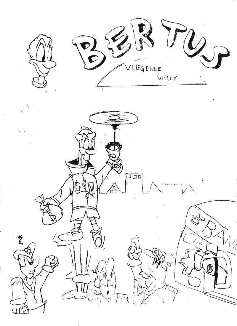 De strip Bertus bestaat al sinds 1997. In dat jaar tekende ik (Alexander Neels, 1986) voor het eerst dit karakter. Er is helaas weinig overgebleven van de allereerste Bertus-strips uit die periode. Toch is er nog een tekening bewaard gebleven uit 1997. En wat voor een! Het is een tekening die vereeuwigd is op een mok. Grappig weetje: op het nummerbord staat de datum (21-08-1997) waarop de tekening is gemaakt.